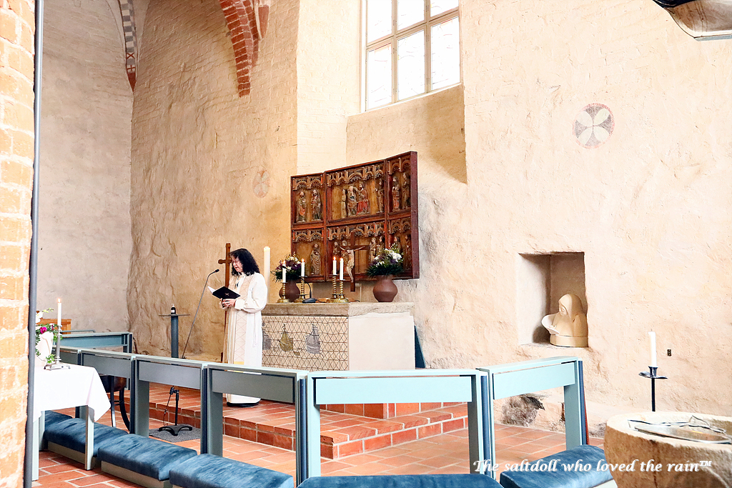 The fixed medieval stone altar was used as a kind of side altar. On weekdays and without the attendance of congregation or assistants, the priest often celebrated private services, or votive masses, at the request of parishioners. Most commonly, these were requiem masses for the souls of the dead. A gravestone from the 13th century, the date having been interpreted as either 1215 or 1290 is preserved on the wall of the sacristy. The Latin text on the stone is translated as follows: "In the year of our Lord 1290 died Ingigerdis, former wife of Pietari: may she rest in peace."