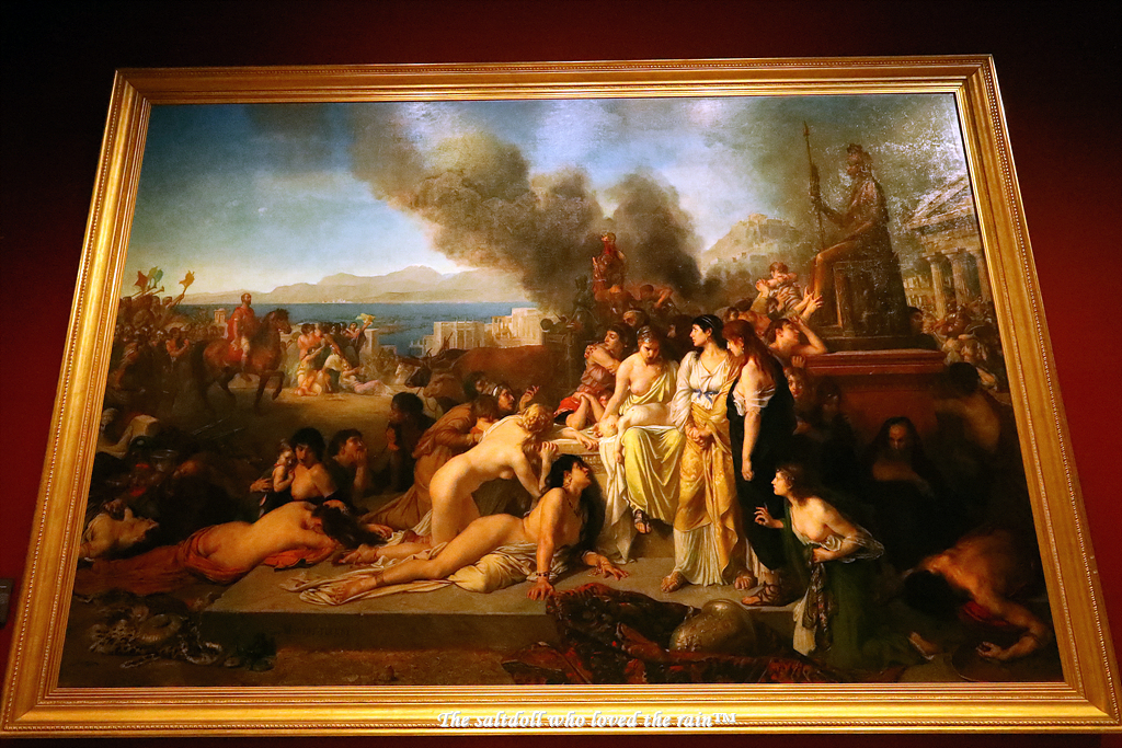 In 146BC, the Greek city of Corinth fell into the hands of Rome. Robert-Fleury depicts the moment when the Roman army enters the plundered city. The women of Corinth, dreading the fate that awaited them, take refuge at the foot of the statue of Athena. The