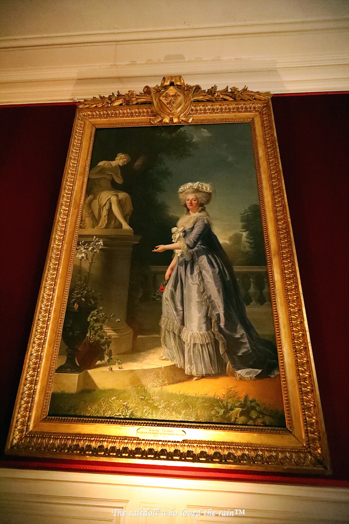 The oval painting by Joseph-Siffred Duplessis on display here depicts Marie-Antoinette without softening any traits: bulging eyes, a prominent forehead, her thick under-lip characteristic of the House of Hapsburg, and her distinctive Habsburg jaw. Despite holding her head remarkably, her fresh complexion and powdery blonde hair, the Dauphine disliked the canvas and rejected it.