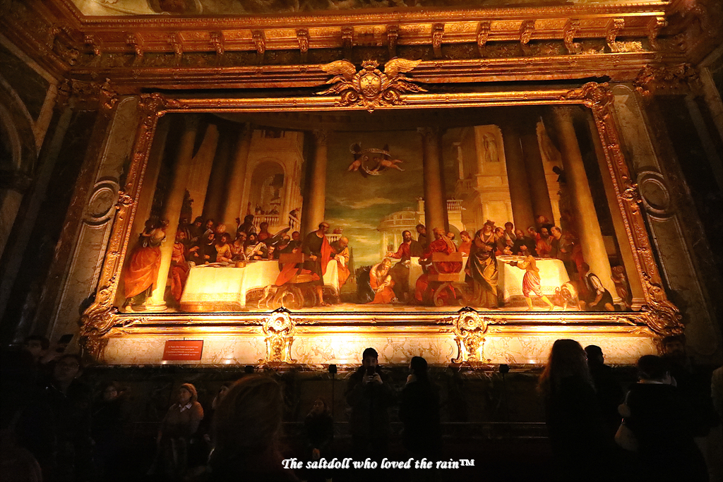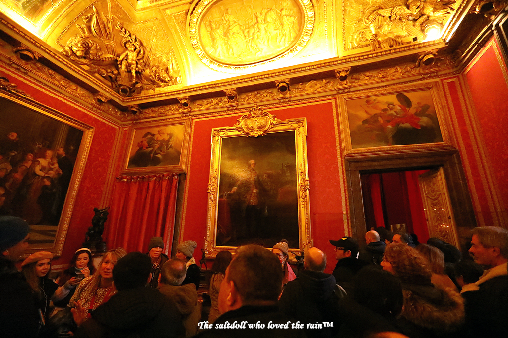 To the left of the chimney is The Family of Darius before Alexander by Charles Le Brun. To the right is The Pilgrims of Emmaus: Paolo Caliari (1528-1588), known as Veronese, was a Venetian Renaissance painter. Find out more about this painting., in the style of Veronese. These two works were hung as a pair upon the king’s request, and demonstrate the desire to show that French painters could rival the greatest Italian masters. Until 1750 there were two platforms on either side of the fireplace, where the two paintings currently hang, which were for the musicians during Evening gatherings: the term used to refer to events in which a number of guests were invited to the king’s apartments. when the room was used for music and dancing.