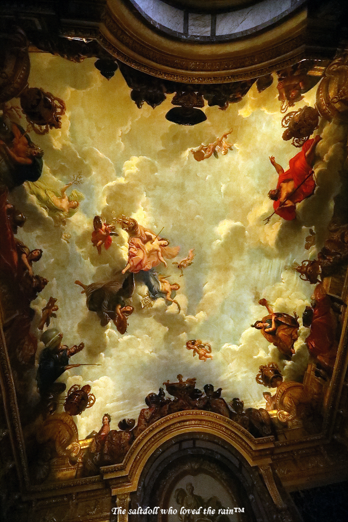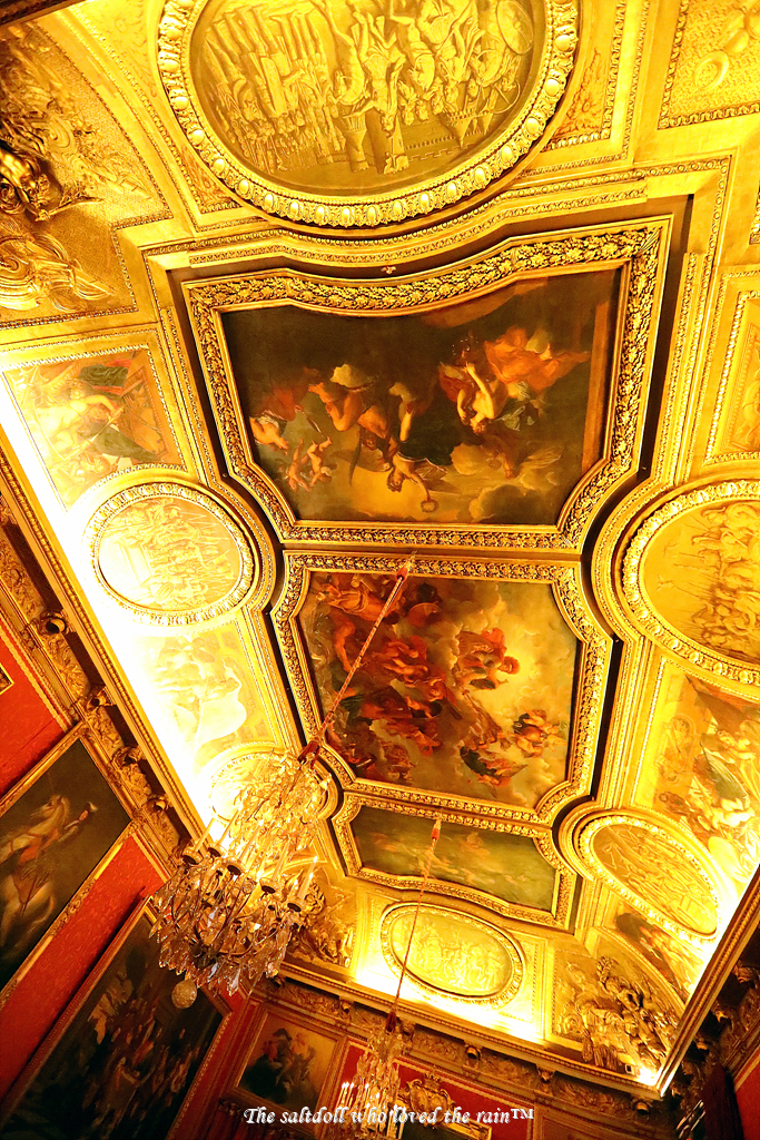 Hardouin Mansart started building the War Room in 1678. The decoration, completed by Le Brun in 1686, pays tribute to the military victories that led to the peace treaties of Nijmegen: and ended the Dutch War (1672-1678). These peace treaties established Louis XIV as an arbitrator for Europe.. The walls are covered with marble panels decorated with six trophies and weapons in gilded bronze. The wall adjacent to the Apollo Room bears an oval stucco bas-relief depicting Louis XIV on horseback trampling his enemies. At the top of this masterpiece by Coysevox are two sculptures of Pheme, and two captives in chains huddle beneath it. Below, in the bas-relief in the fake fireplace, Clio, the muse of history, is recording the king’s great deeds for posterity. In the center of the cupola ceiling is a personified depiction of France, armed and sitting on a cloud and surrounded by Victories. Her shield is decorated with a portrait of Louis XIV. Her three defeated enemies: during the Dutch War (1672-1678) France fought against Germany, Spain, and the Dutch Republic, until the treaty of Nijmegen. are depicted in the arches: the arches in the vault.: Germany kneeling down with an eagle; Spain making threats with a roaring lion; Holland overturned on another lion. The fourth arch depicts Bellona, the goddess of war, in a rage of fury between Rebellion and Contention.