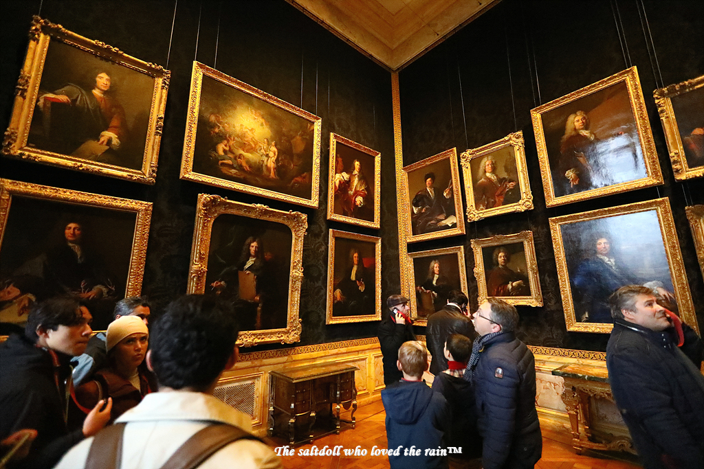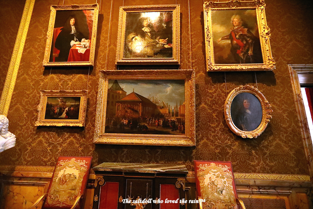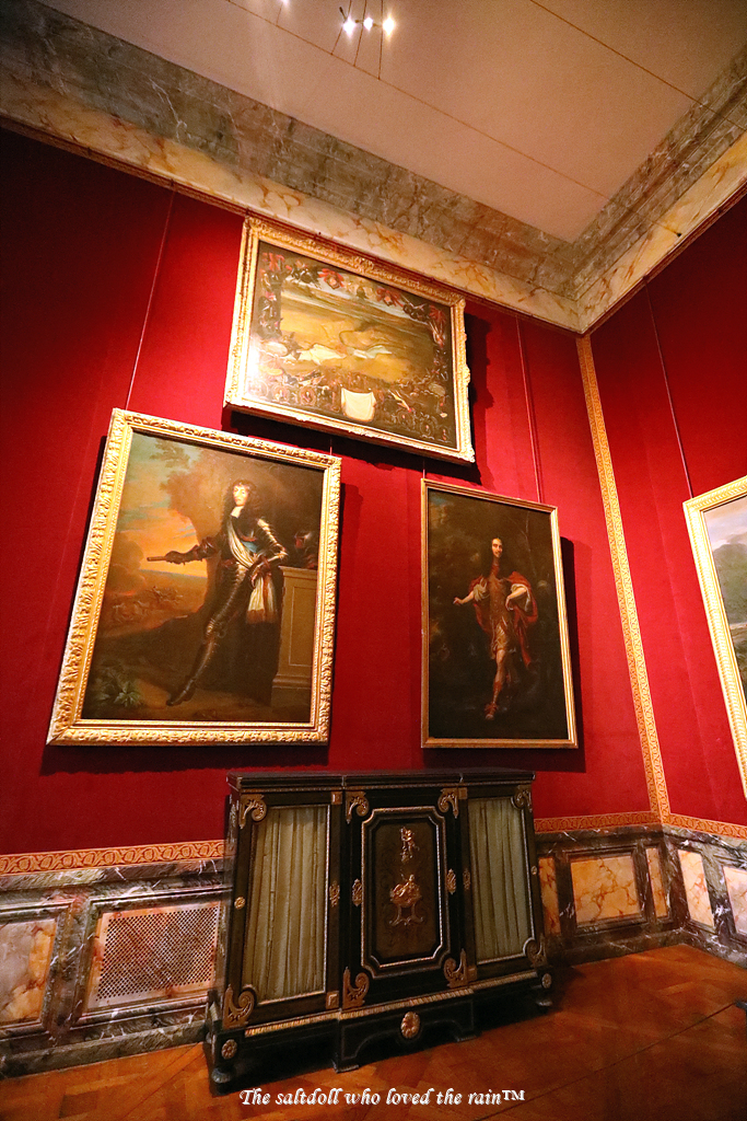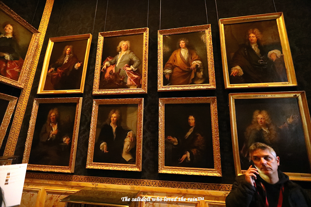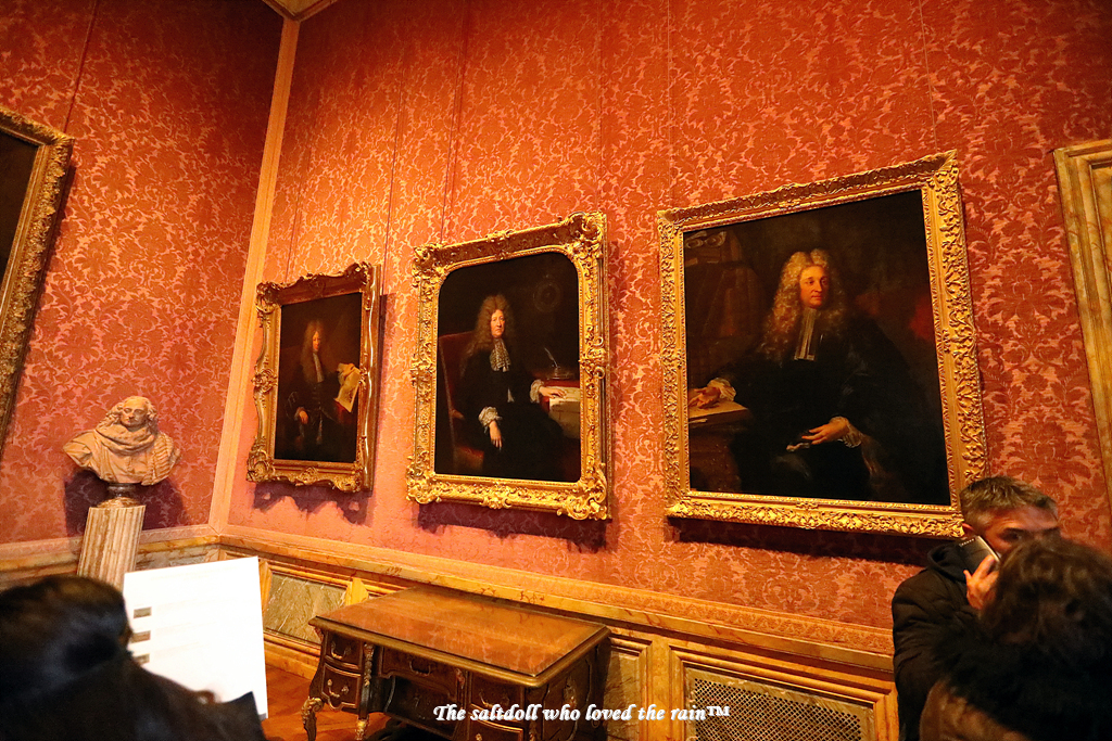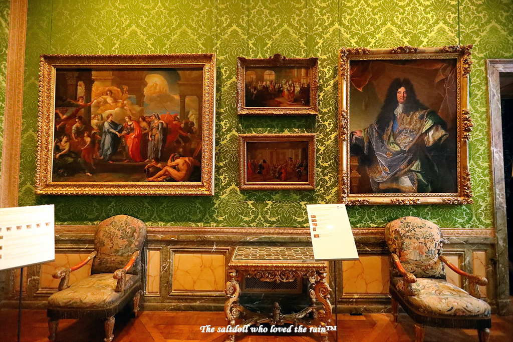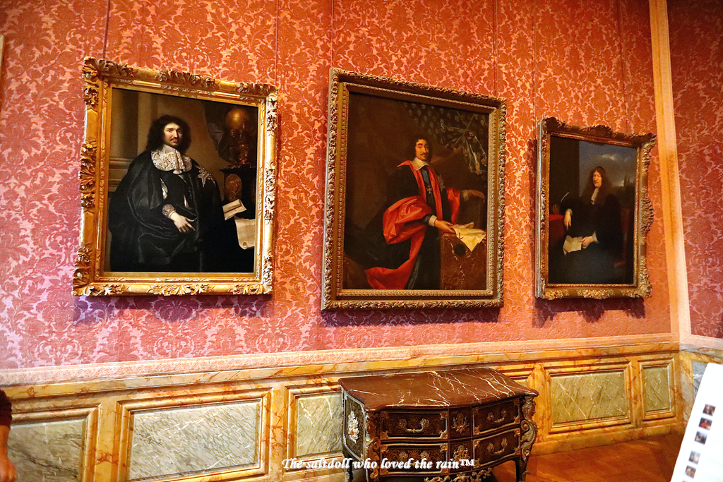 celebrating the monarch's achievements, while Jean de La Fontaine dedicated his first Fables to the Dauphin, the Sun King's son, The paintings hanging between the two windows are what remains of a gallery of portraits of women from the court of Louis XIV, who can be identified by the inscriptions in gold lettering. Their dresses and jewelry testify to their important position in society. In the 17th century, portraits were very popular and were often copied and collected.