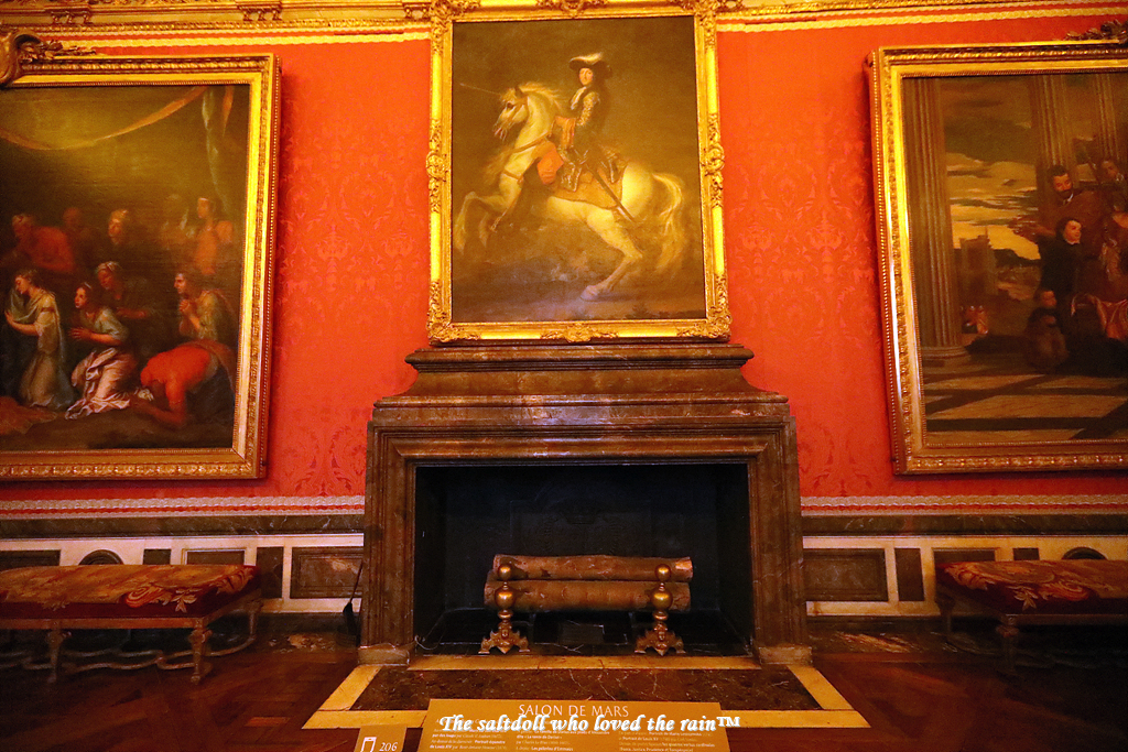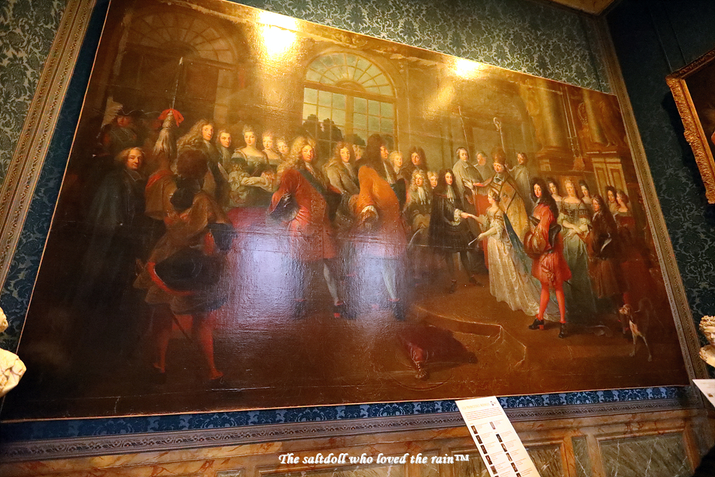 The big painting in the middle of the room is a cartoon, a very large painting produced as a model for a tapestry. In 1664, Louis XIV commissioned a series of such paintings to celebrate the major events of his reign, called The History of the King This cartoon, which was never woven into a tapestry, is the last piece of the collection. Painted by Antoine Dieu, it shows the marriage of the king's grandson to Marie Adélaïde, the daughter of the Duke of Savoy. This marriage put an end to the War of the League of Augsburg.