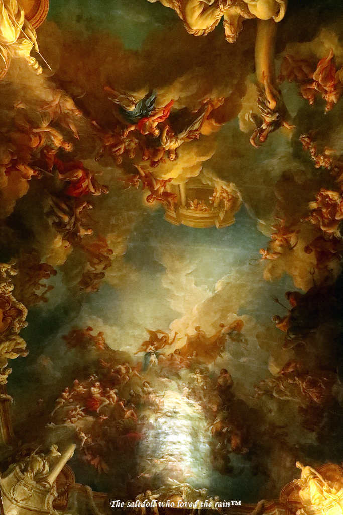 Allegory to the Glory of Louis XIV, by Antoine Coypel, underlines the power afforded to the king by his military successes. The monarch is represented as a Roman emperor sitting on a throne with a laurel crown being placed on his head by a woman symbolizing Glory. To his right is Public Felicity with her chest uncovered, while Victory is on his left.