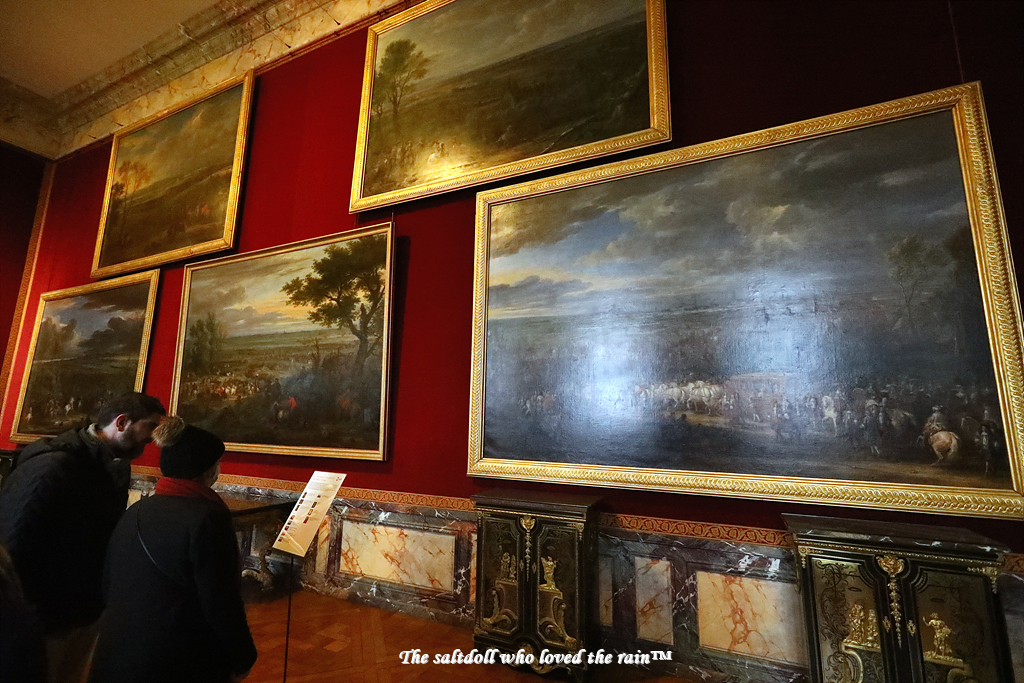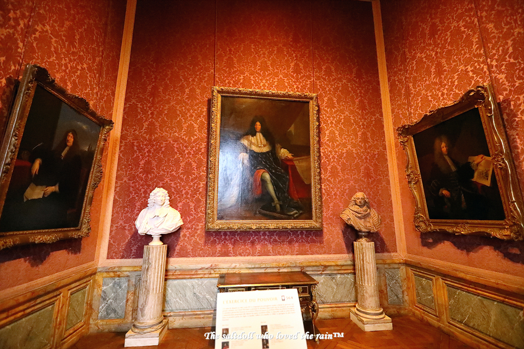 The Sun King accompanied and directed his troops until the age of fifty-five, but did not take part in any battles in person. The men in the royal family were expected to do the same, but not to outshine him with their brilliance in battle. Louis XIV was also surrounded by military professionals such as his minister, the Marquis de Louvois, whose portrait is displayed in this room, and who was known for his military efficiency but also his brutality.