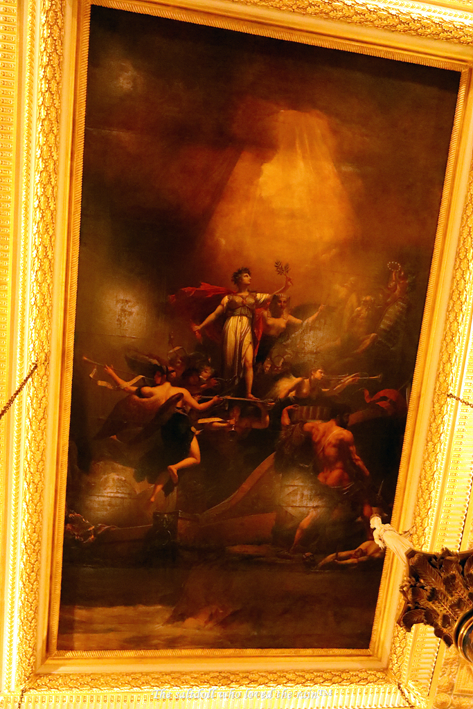 The room’s Napoleonic program included other works as well: on the ceiling, the Allegory of 18 Brumaire by Callet Antoine-François Callet (1741-1823) was a French allegorical painter and portraitist. He was the official portrait painter to Louis XVI., also called France Saved, symbolizing Napoleon Bonaparte’s seizure of power; and above the door, four allegories by François Gérard: The Warrior’s Courage, Genius Rising Despite Desire, Constancy, and Clemency Leaning on Force.