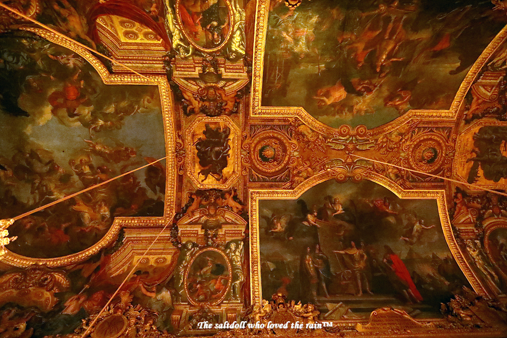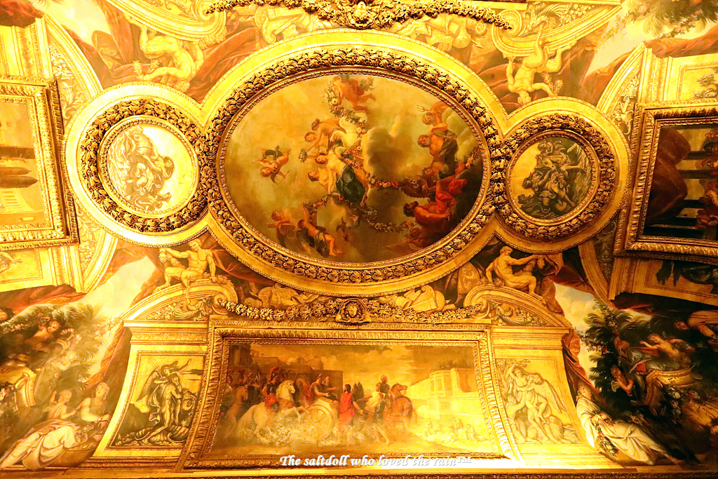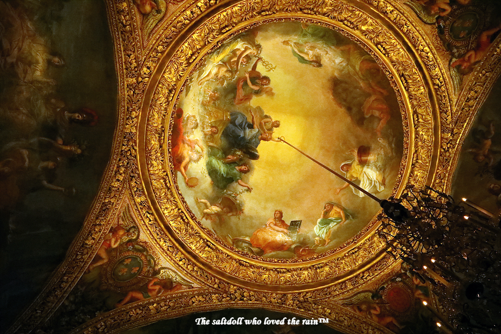 Following on from the victory over the three united powers: the Dutch War (1672-1678) in which France fought against Germany, Spain, and the Dutch Republic, until the peace treaty of Nijmegen., depicted in the War Room, the whole length of the Hall of Mirrors (73m) pays tribute to the political, economic and artistic success of France. Political successes are illustrated through the 30 painted compositions on the vaulted ceiling by Le Brun, which depict the glorious history of Louis XIV during the first 18 years of his reign, from 1661 to the peace treaties of Nijmegen: ended the Dutch War (1672-1678). These peace treaties established Louis XIV as an arbitrator for Europe.. Military and diplomatic victories and reforms with a view to reorganizing the kingdom are illustrated through allegories from Antiquity. Economic prosperity is revealed in the number and size of the 357 mirrors bedecking the 17 arches opposite the windows, demonstrating that the new French manufacturer could rival the Venetian monopoly on mirror manufacturing. At the time such items were a great luxury. Artistic success is shown by the Rouge de Rance pilasters topped with capitals of gilded bronze based on a new design, which was referred to as “the French style” and was created by Le Brun upon the request of Colbert. The design incorporates the national emblems, with a fleur-de-lis topped by a royal sun between two Gallic roosters (the Latin word for rooster was gallus).
