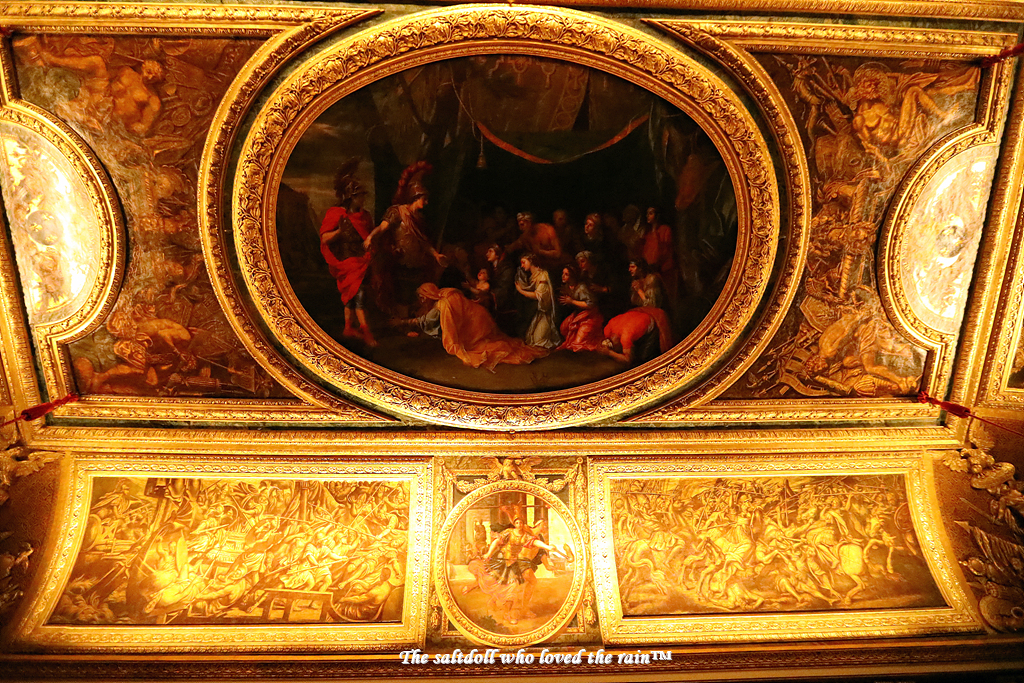 Designed as the sovereign’s Ceremonial Room, the Apollo Room was used as a throne room from 1682 onwards. The ceiling was dedicated to the Sun King, the arts, and peace. The symbol of the sun, adopted early on by Louis XIV, is illustrated through the image of Apollo on his chariot surrounded by allegorical figures. The arches: the arches in the vault illustrate the king’s magnificence and magnanimity through various examples from Antiquity: Vespasian building the Colosseum; Augustus building the port of Miseno, Porus before Alexander and Coriolan entreated by his wife and mother to spare Rome.
