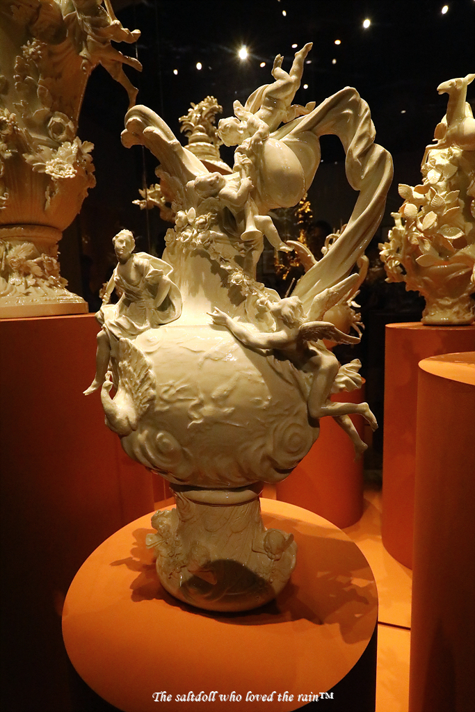 Around the central piece are symmetrically grouped a series of lidded vases and slightly smaller pots depicting the Four Elements: fire, water, air, and earth, personified by Jupiter, Neptune, Juno, and Diana. The detailed reliefs show the human activities associated with them: the art of war, navigation, falconry, and hunting.
