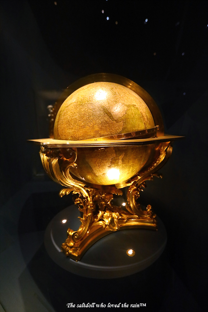 Several coordinated mechanisms drive the different parts. At the top, the hour dial shows the hours of true and average time and, in a window, the days, months, and calendar years. Slightly below, a small gold and silver sphere illustrates the age and phases of the moon. On the right, a planetary globe shows the then-known planets in their orbits, respecting the variations in the speed of their courses and in their positions in relation to the Sun. In the lower part, a globe engraved with a map of the explored lands - captioned with the names of cities, rivers, and countries - affects its revolution in 24 hours.