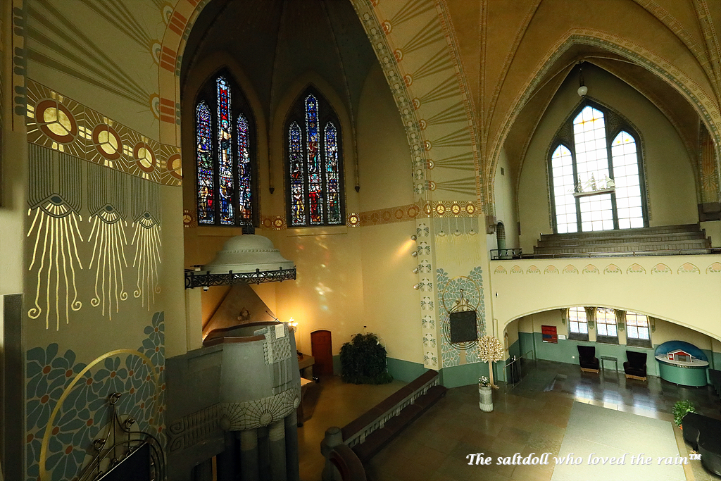 Max Frelander the architect, who worked as an assistant to Sonck, has contributed to the interior design. A rich Jugend ornamentation decorates both the interior, the staircases, and the windows. The altar, the pulpit, the altar rail, and the window frame are all made of Finnish soapstone. The central motif of the altar is a cross, on whose base there is a symmetrical carving of two serpents. Also on the corner level of the altar rail, there are rings of twisting serpents. The top of the cross is ornamented with a dove, the symbol of the Holy Spirit. The Jugend windows of the choir, which depict Finnish pine, were destroyed in a bombing raid during the Finnish Winter War (1939-1940). The national romantic movement is particularly dominant in the design of the choir. Motifs of Finnish nature are associated with traditional Christian symbolism.