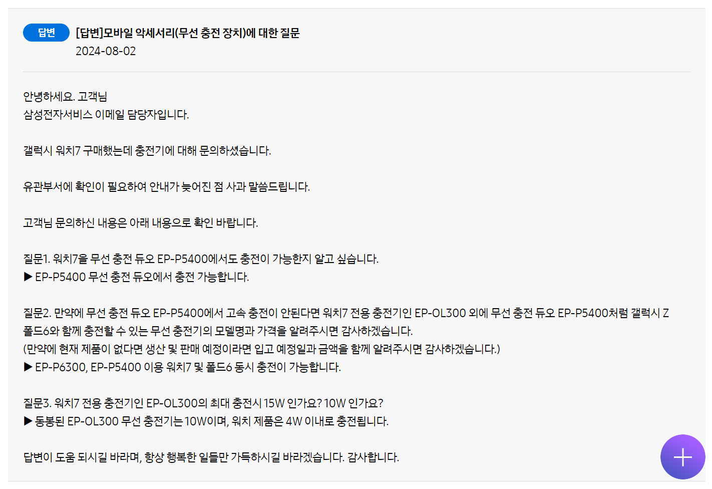 동봉된 EP-OL300 무선 충전기는 10W이며, 워치 제품은 4W 이내로 충전) - 2024.08.02 현재, 참고로 삼성전자의 무선 충전기인 EP-P5400, EP-P6300, EP-P5400 모두 워치7 충전이 가능하다는 삼성전자 서비스의 답변을 받음.