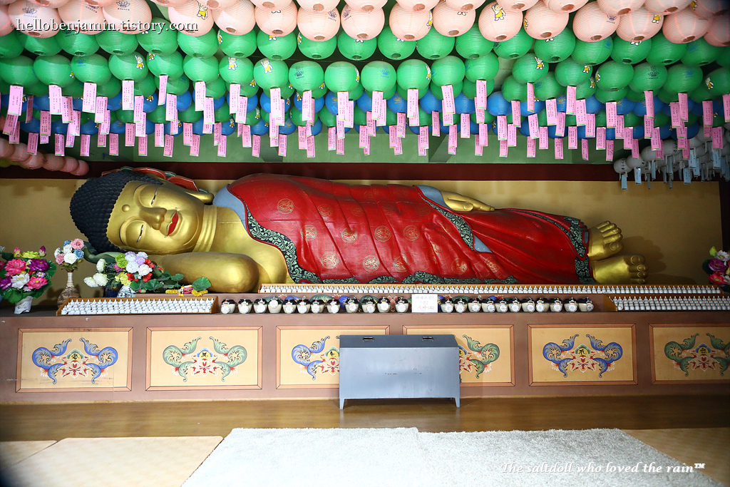 [와우정사에는 세계에서 가장 큰 목조 불상으로 기네스북에 등재된 인도산 향나무로 만든 누워 있는 불상이 있습니다.