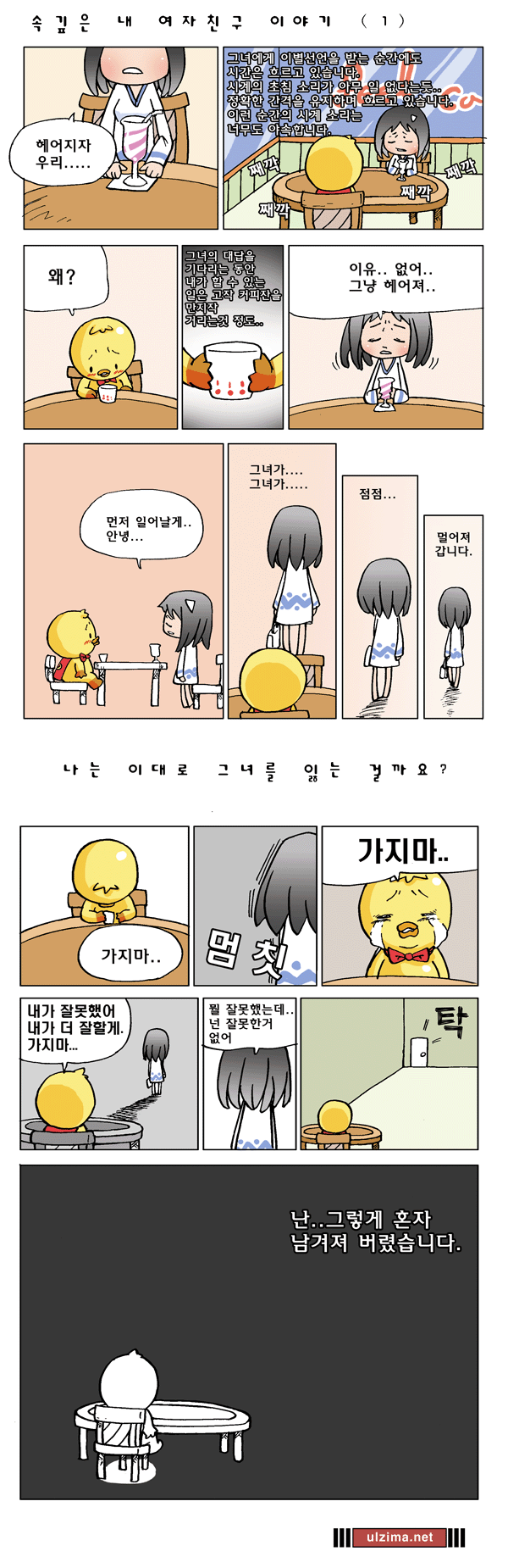 내가무척이나좋아하는카튠이하나있다. 그것은울지마닷넷에서연재되고있는"속깊은내여자친구이야기"이고,하나더꼽으라면,현재파란에서연재되고있는럽스토리가그것이다. 글쎄~ 말이필요없을것같다. 특히속깊은내여자친구이야기는너무도내마음같아서마음이아프고슬프다. 어디까지가픽션이고,어디까지가논픽션일까~ 난,바보라서다논픽션같아서더슬프다.ㅡㅜ 속 깊은 내 여자친구 이야기 1 ~ 18 From http://www.ulzima.net http://ww25.ulzima.net/?subid1=20230117-0433-177e-b2e5-870ce55e302b ww25.ulzima.net (2023년 기준 모든 정보가 삭제되어 새로 업데이트 합니다.) 그녀가 일하던 가게.. 오늘은 문이 닫혀있습니다. 흐르고 있는 곡은 나를 그녀와 처음 만나게 해준..